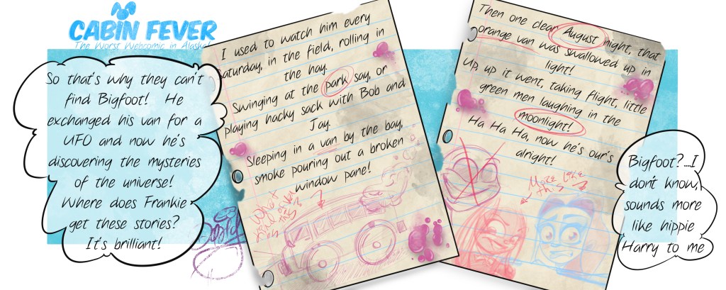 David is the creator of the Alaskan webcomic Cabin Fever, author and illustrator of several books, and the mind behind Curmudgeon County Collectables. Growing up in Alaska he discovered early in life the joys of exploring the outdoors under the northern lights and the midnight sun. He also discovered mosquitoes, bears, sunburn and Bigfoot……okay, Bigfoot’s debatable. While recovering from the joys of the outdoors he happened upon his favorite pastimes, drawing and daydreaming! He is a member of the Society of Children’s Book Writers and Illustrators, a closet musician, and a big fan of pizza! View all posts by Curmudgeon County Collectables