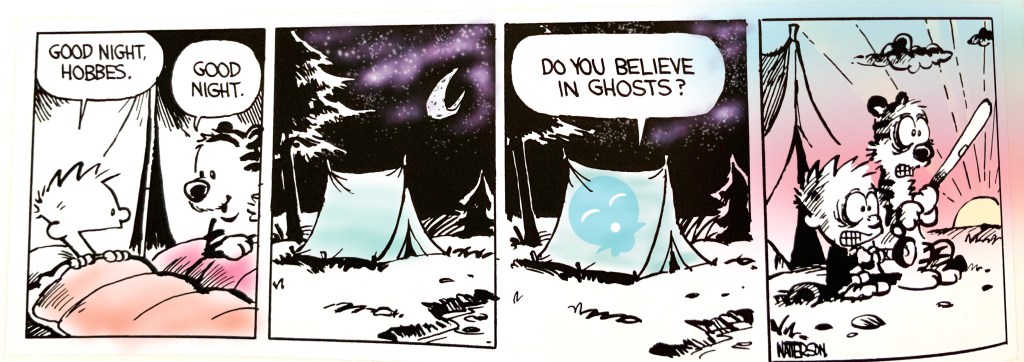 Welcome back to Coloring Calvin and Hobbes! We’re picking some of the classic daily strips and adding a little color, in various styles, to pay tribute to this delightful comic by Bill Watterson. So pull out your old C&H comic books, grab some colored pencils, crayons, or markers and join us on this journey! Don’t have a C&H comic book? No problem, all the strips are available online, just click here to find C&H on GoComics! This week we see a happy camping excursion gone awry by pondering the possibility of the afterlife. I love the expressions in the final panel!