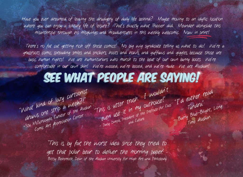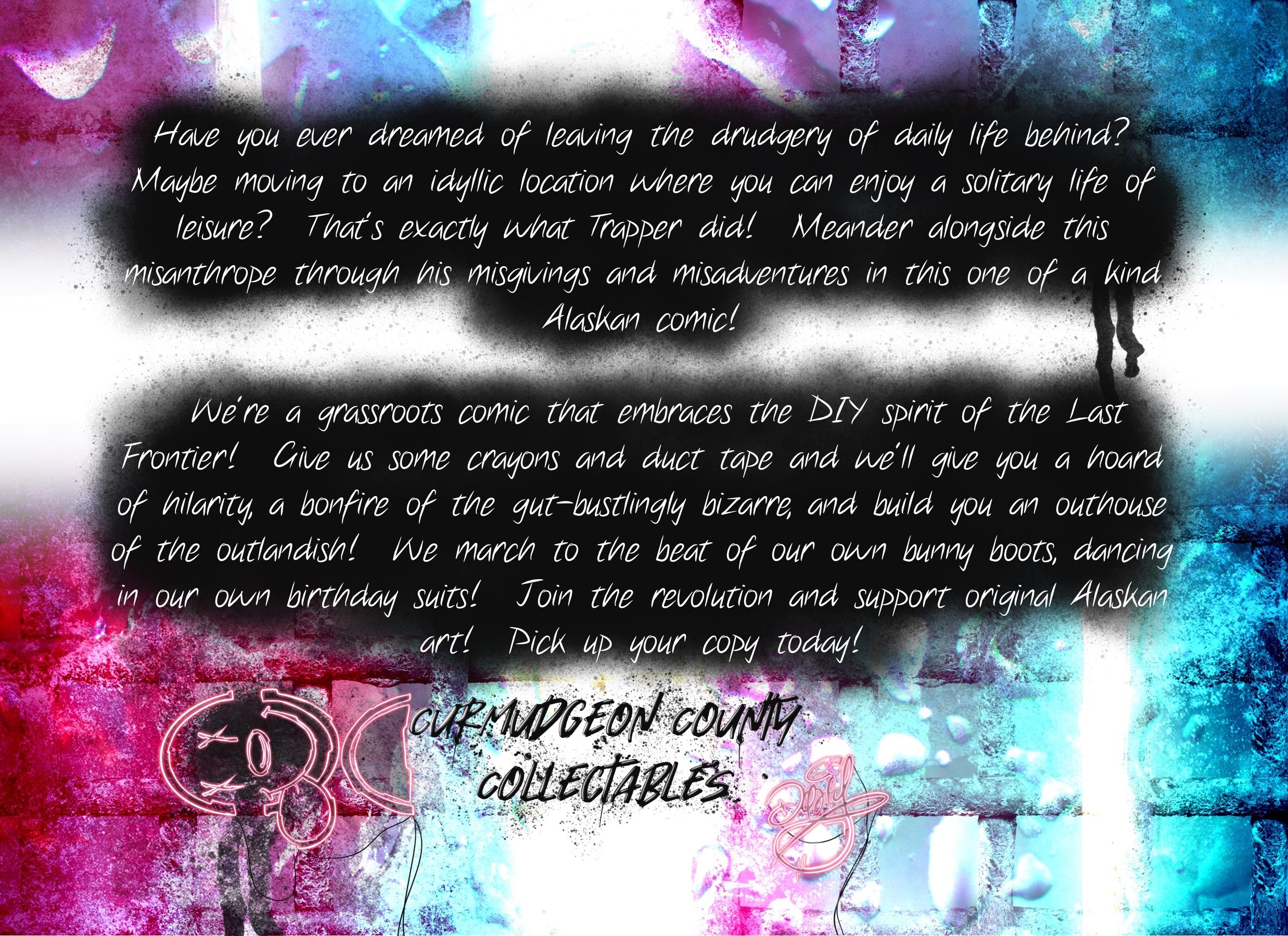 Have you ever dreamed of leaving the drudgery of daily life behind? Maybe moving to an idyllic location where you can enjoy a solitary life of leisure? That’s exactly what Trapper did! Meander alongside this misanthrope through his misgivings and misadventures in this one of a kind Alaskan comic! Within this collection you’ll find 50, full color, comic strips, 5 short stories, as well as additional artwork and other bits and pieces. Perfect for any fan of classic comics like Peanuts, Garfield, or Calvin and Hobbes. Also a great gift for anyone who enjoys the outdoors, oddball humor, or misanthropy! We’re a grassroots comic that embraces the DIY spirit of the Last Frontier! Give us some crayons and duct tape and we’ll give you a hoard of hilarity, a bonfire of the gut-bustingly bizarre, and build you an outhouse of the outlandish! We march to the beat of our own bunny boots, dancing in our own birthday suits! Join the revolution and support original Alaskan art! Pick your copy today!