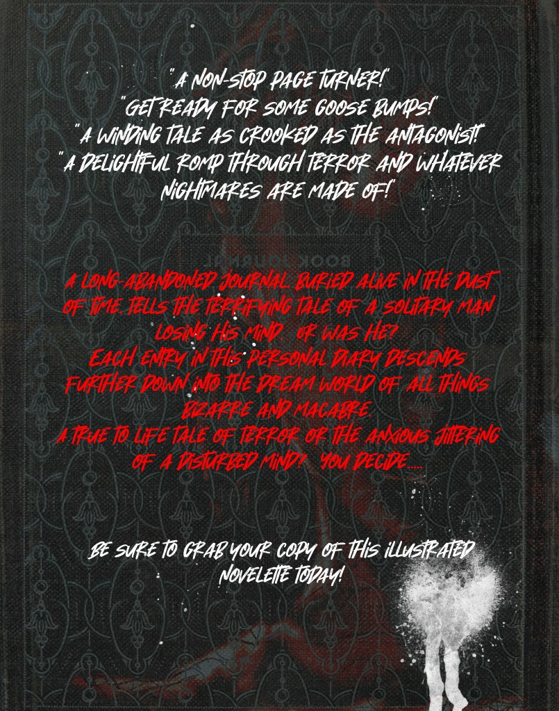 A long-abandoned journal, buried alive in the dust of time, tells the terrifying tale of a solitary man losing his mind. Or was he? Each entry in this personal diary descends further down into the dream world of all things bizarre and macabre. A true to life tale of terror or the anxious jittering of a disturbed mind? You decide…..