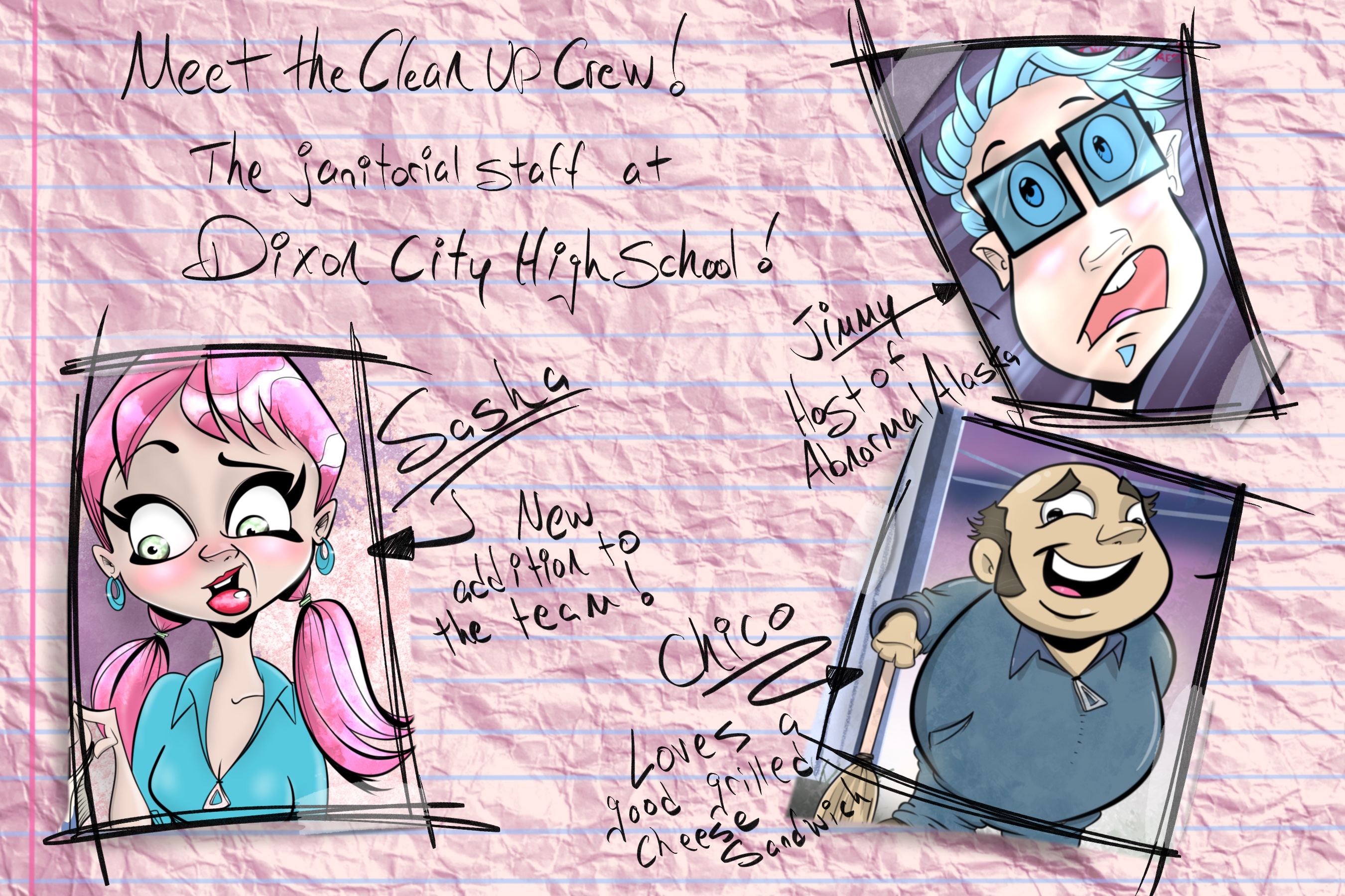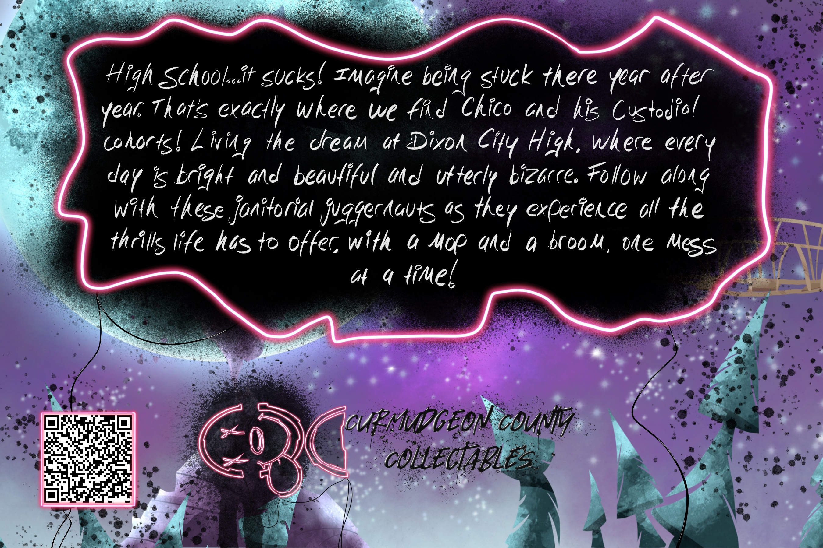 High School…it sucks! Imagine being stuck there year after year after year after year…. That’s exactly where we find Chico and his custodial cohorts! Living the dream at Dixon City High School, where every day is bright and beautiful and utterly bizarre. Follow along with these janitorial juggernauts as they experience all the thrills life has to offer, with a mop and a broom, one mess at a time! In this collection you’ll find 50 comics, 5 short stories, as well as additional artwork!