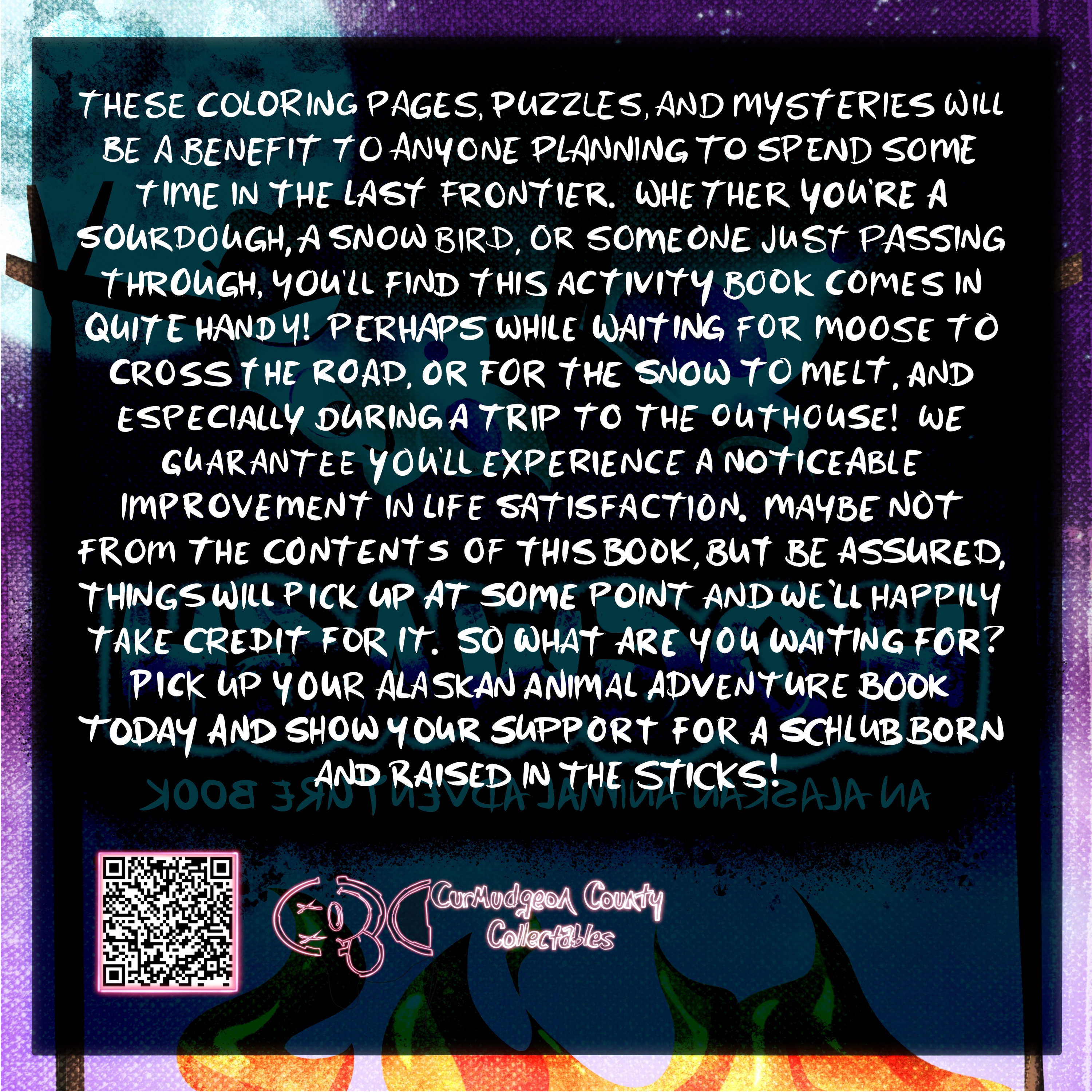This activity book is packed with coloring pages, puzzles, and mad lib style mysteries! It will be of great benefit to anyone planning to spend some time in the Last Frontier. Whether you’re a sourdough, a snow bird, or someone just passing through, you’ll find this activity book comes in quite handy! Perhaps while waiting for moose to cross the road, or for the snow to melt, and especially during a trip to the outhouse! We guarantee you’ll experience a noticeable improvement in life satisfaction. Maybe not from the contents of this book, but be assured, things will pick up at some point and we’ll happily take credit for it. So what are you waiting for? Pick up your Alaskan animal adventure book today and show your support for Alaskan art and a schlub born and raised in the sticks!