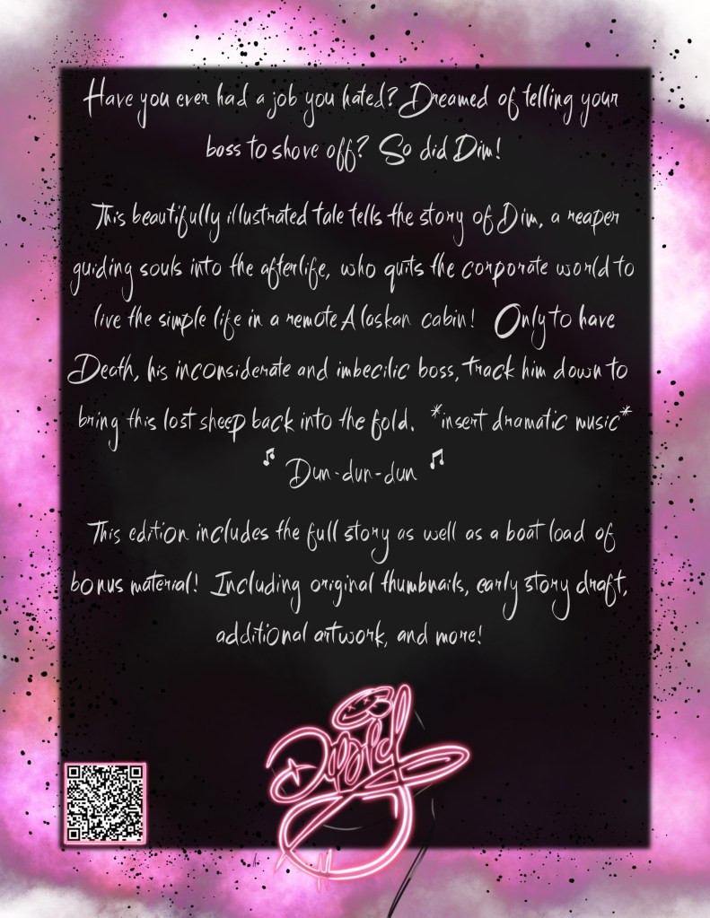 This beautifully illustrated tale tells the story of Dim, a reaper guiding souls into the afterlife, who quits the corporate world to live the simple life in a remote Alaskan cabin! Only to have Death, his inconsiderate and imbecilic boss, track him down to bring this lost sheep back into the fold. insert dramatic music Dun-dun-dun
